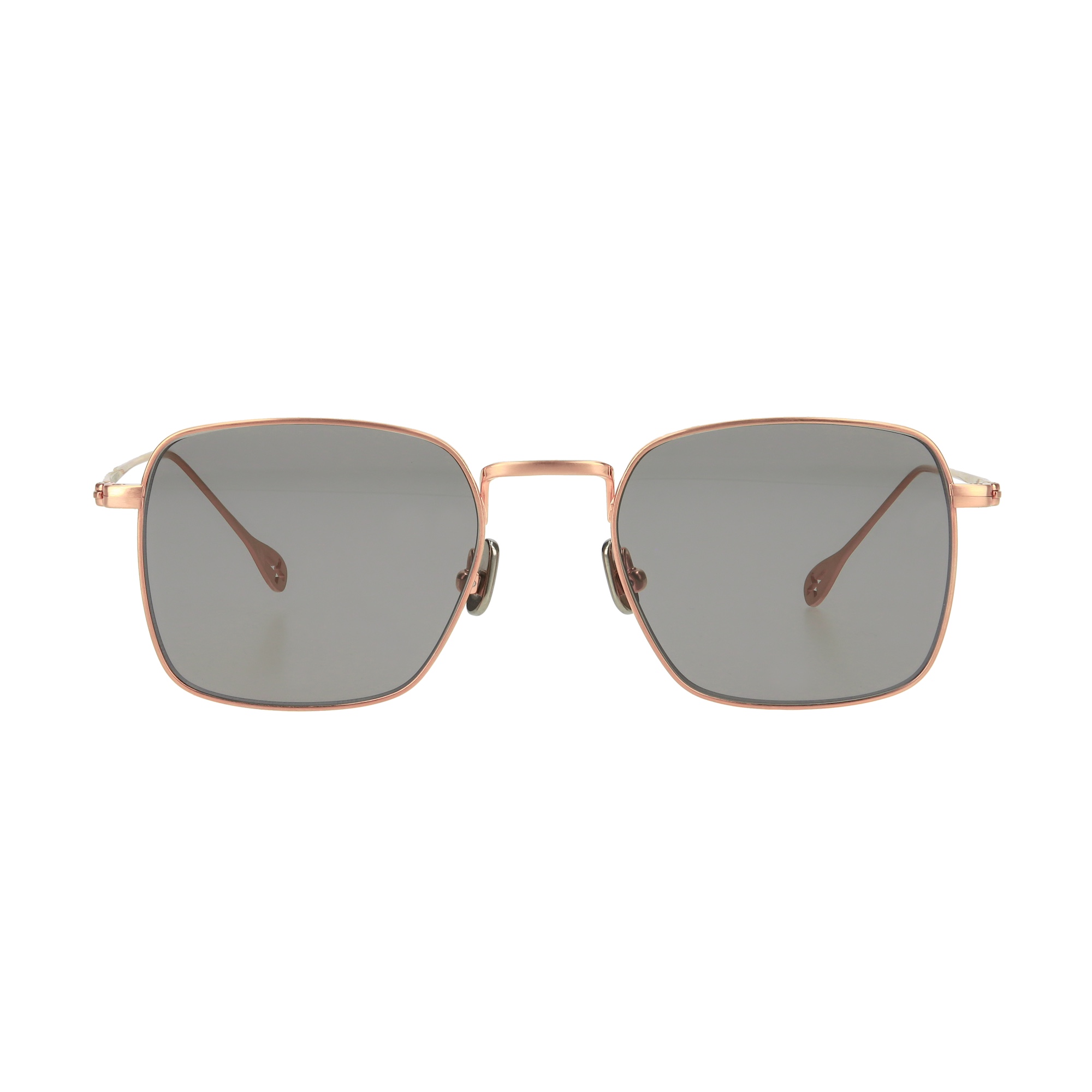 オールチタン製のスクエア型。アレルギーなどの体質に配慮したニッケルフリーを採用。チタン製のノーズパットにはブランドロゴがレーザーで刻印。 テンプルエンドにはブランドロゴが彫られています。この2枚のレンズがまるで盾の様に見える事から”ESCUDO”と名づけました。