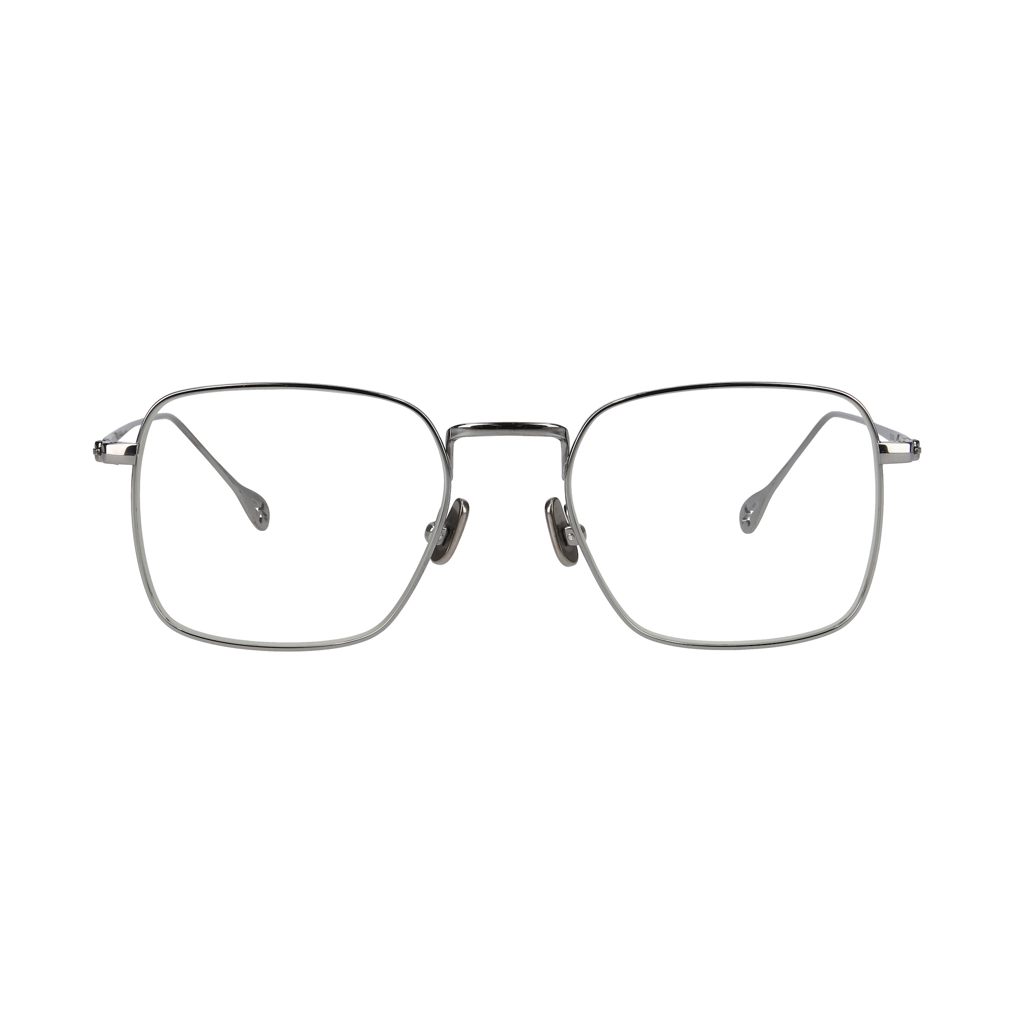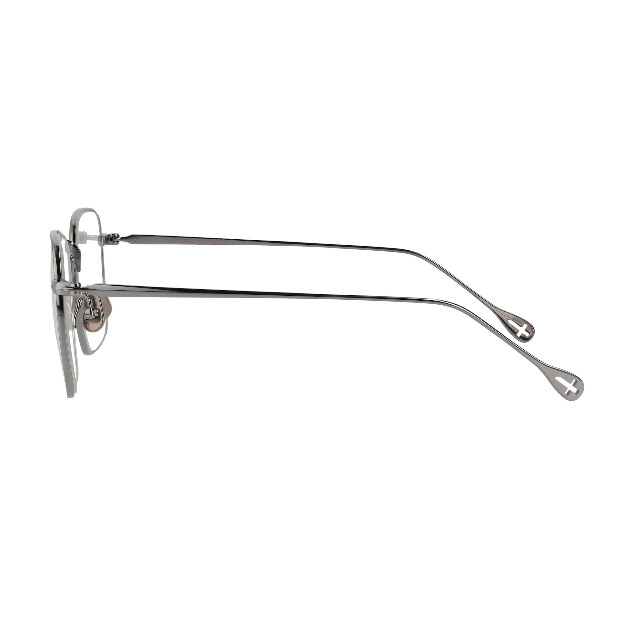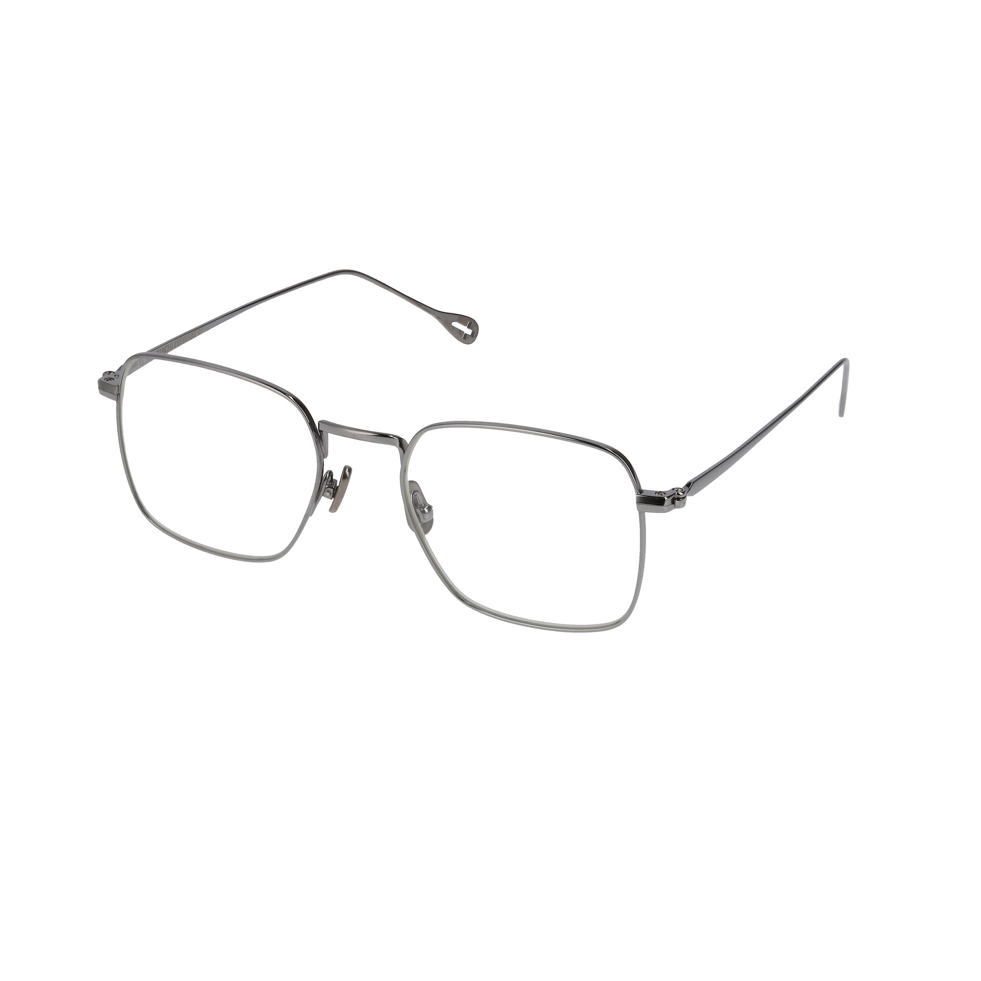 オールチタン製のスクエア型。アレルギーなどの体質に配慮したニッケルフリーを採用。チタン製のノーズパットにはブランドロゴがレーザーで刻印。 テンプルエンドにはブランドロゴが彫られています。この2枚のレンズがまるで盾の様に見える事から”ESCUDO”と名づけました。