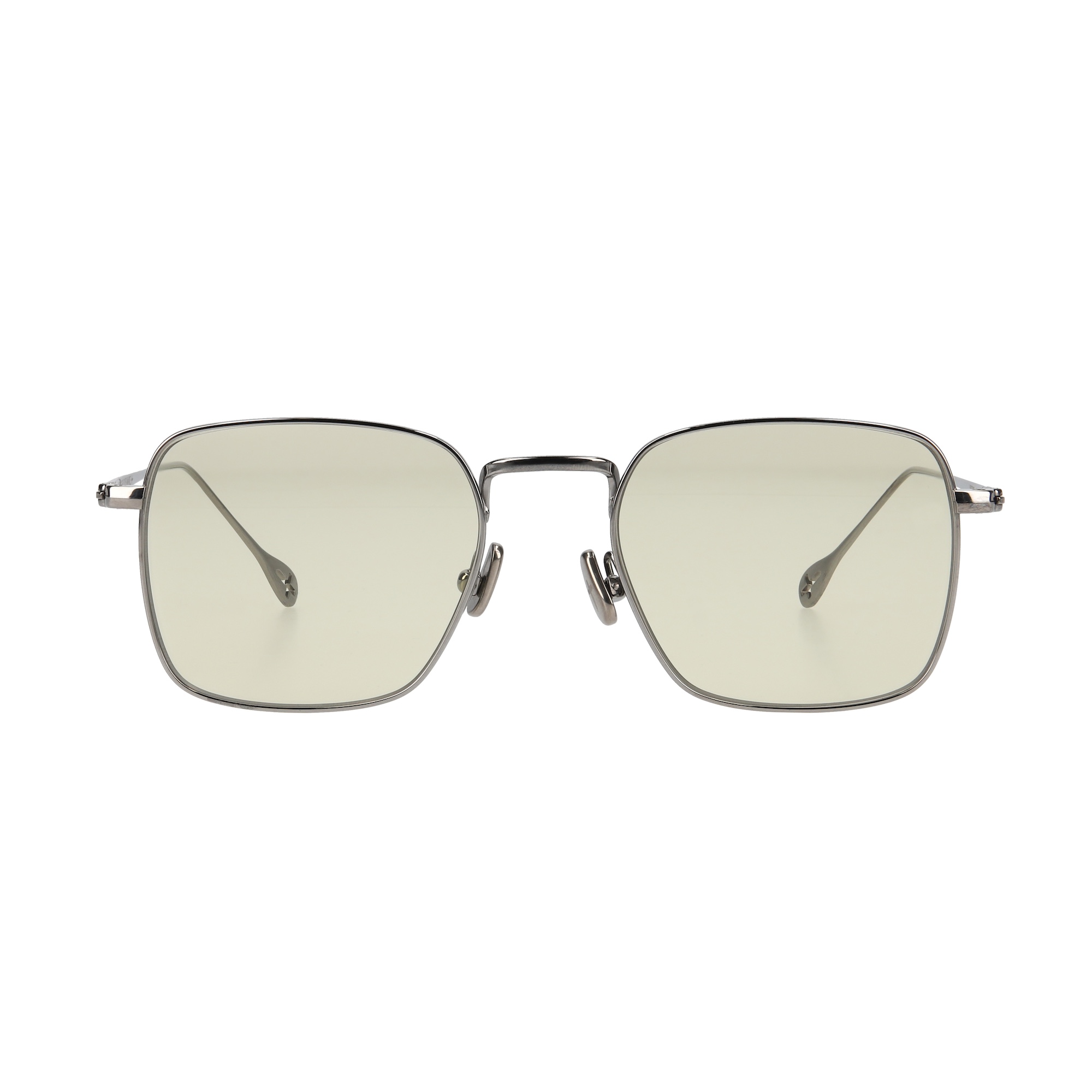 オールチタン製のスクエア型。アレルギーなどの体質に配慮したニッケルフリーを採用。チタン製のノーズパットにはブランドロゴがレーザーで刻印。 テンプルエンドにはブランドロゴが彫られています。この2枚のレンズがまるで盾の様に見える事から”ESCUDO”と名づけました。